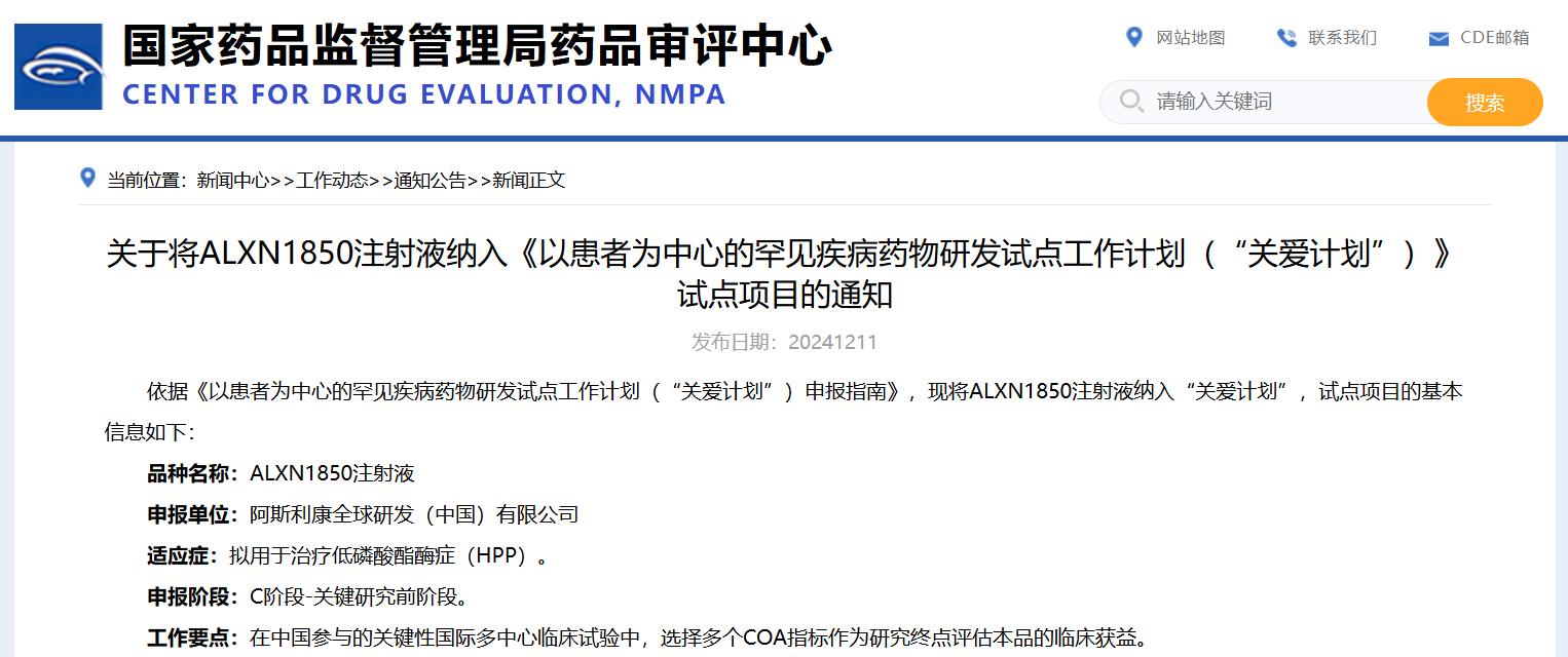 關(guān)于將ALXN1850注射液納入《以患者為中心的罕見疾病藥物研發(fā)試點(diǎn)工作計(jì)劃(“關(guān)愛計(jì)劃”)》試點(diǎn)項(xiàng)目的通知