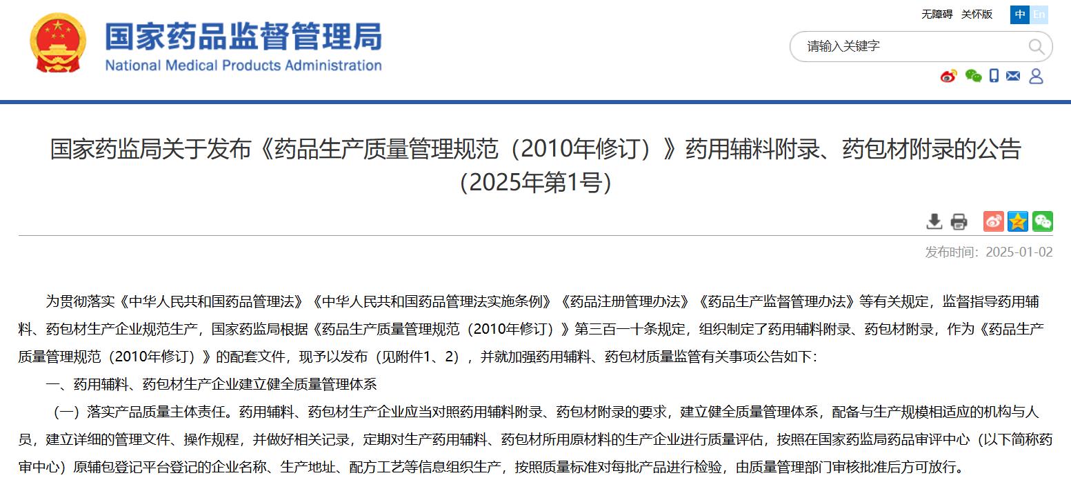 國家藥監(jiān)局關(guān)于發(fā)布《藥品生產(chǎn)質(zhì)量管理規(guī)范(2010年修訂)》藥用輔料附錄、藥包材附錄的公告(2025年第1號)