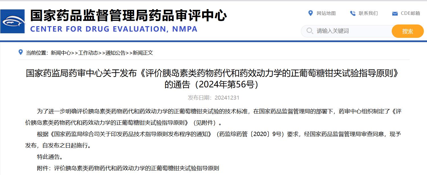 國家藥監(jiān)局藥審中心關(guān)于發(fā)布《評價胰島素類藥物藥代和藥效動力學的正葡萄糖鉗夾試驗指導(dǎo)原則》的通告(2024年第56號)