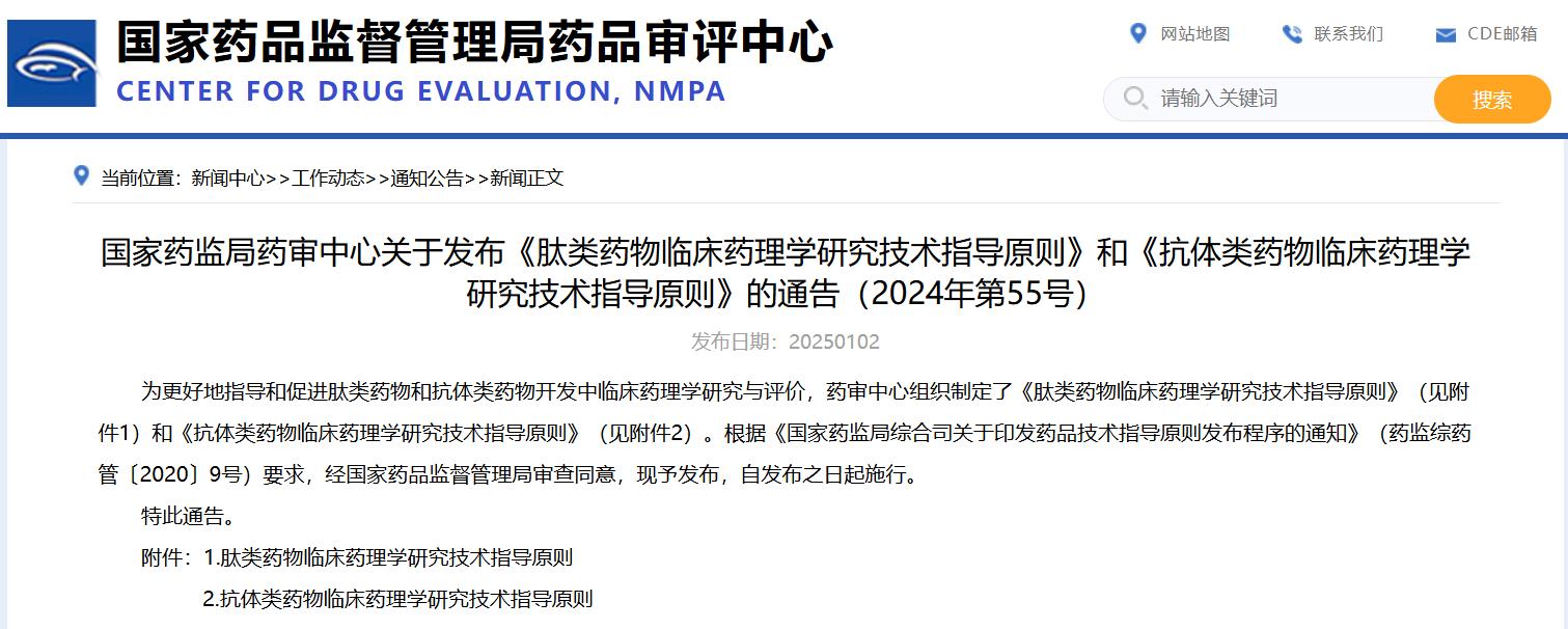 國家藥監(jiān)局藥審中心關(guān)于發(fā)布《肽類藥物臨床藥理學研究技術(shù)指導(dǎo)原則》和《抗體類藥物臨床藥理學研究技術(shù)指導(dǎo)原則》的通告(2024年第55號)