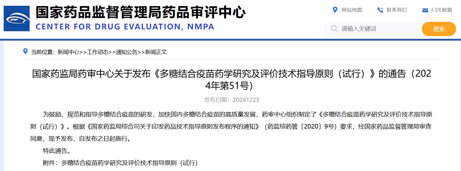 國家藥監(jiān)局藥審中心關(guān)于發(fā)布《多糖結(jié)合疫苗藥學研究及評價技術(shù)指導(dǎo)原則(試行)》的通告(2024年第51號)