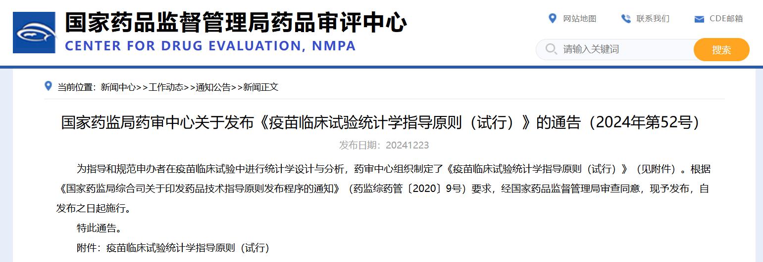 國家藥監(jiān)局藥審中心關(guān)于發(fā)布《疫苗臨床試驗統(tǒng)計學指導(dǎo)原則(試行)》的通告(2024年第52號)