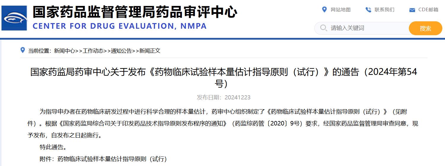 國家藥監(jiān)局藥審中心關(guān)于發(fā)布《藥物臨床試驗樣本量估計指導(dǎo)原則(試行)》的通告(2024年第54號)