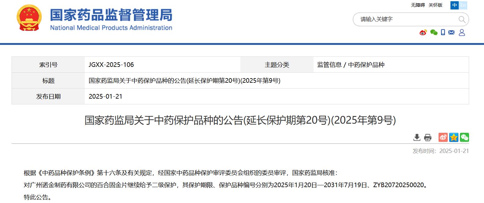 國家藥監(jiān)局關于中藥保護品種的公告(延長保護期第20號)(2025年第9號)