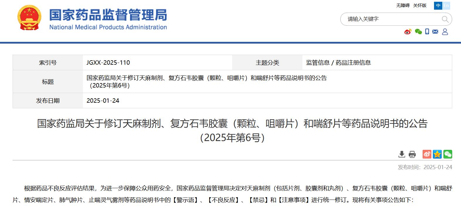 國家藥監(jiān)局關于修訂天麻制劑、復方石韋膠囊(顆粒、咀嚼片)和喘舒片等藥品說明書的公告(2025年第6號)