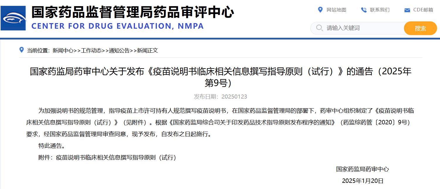 國家藥監(jiān)局藥審中心關于發(fā)布《疫苗說明書臨床相關信息撰寫指導原則(試行)》的通告(2025年第9號)