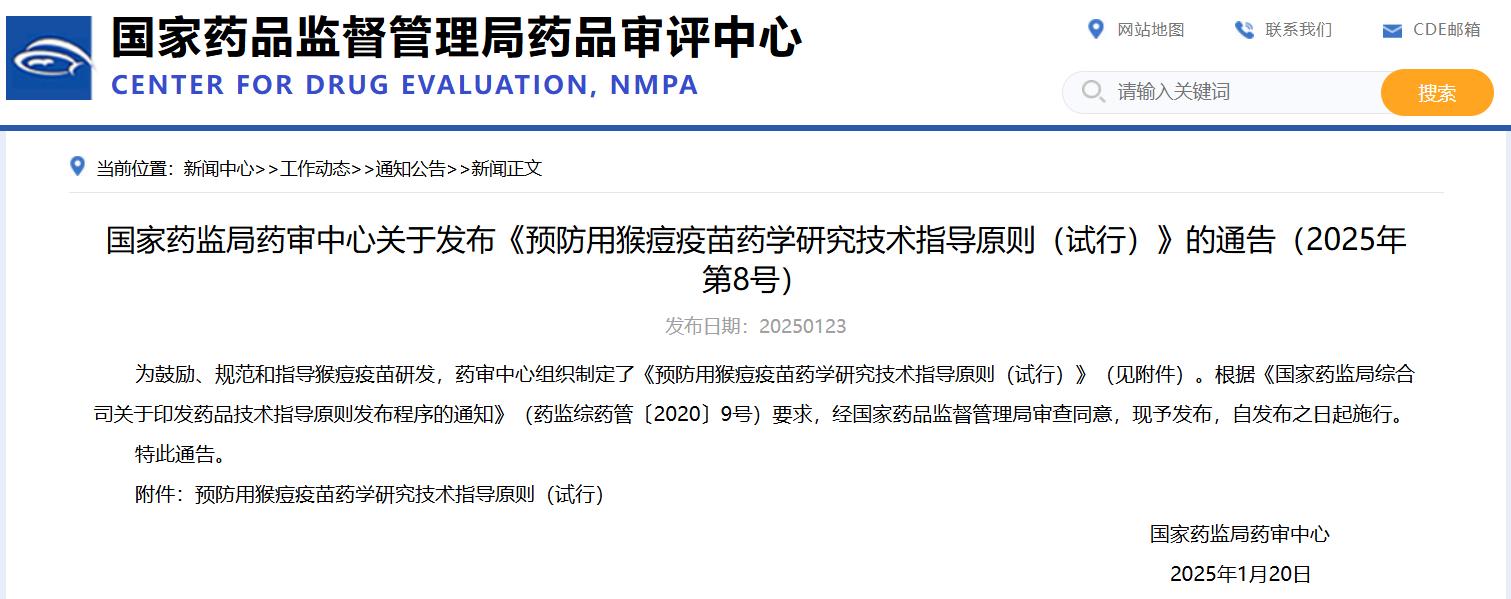 國家藥監(jiān)局藥審中心關于發(fā)布《預防用猴痘疫苗藥學研究技術指導原則(試行)》的通告(2025年第8號)