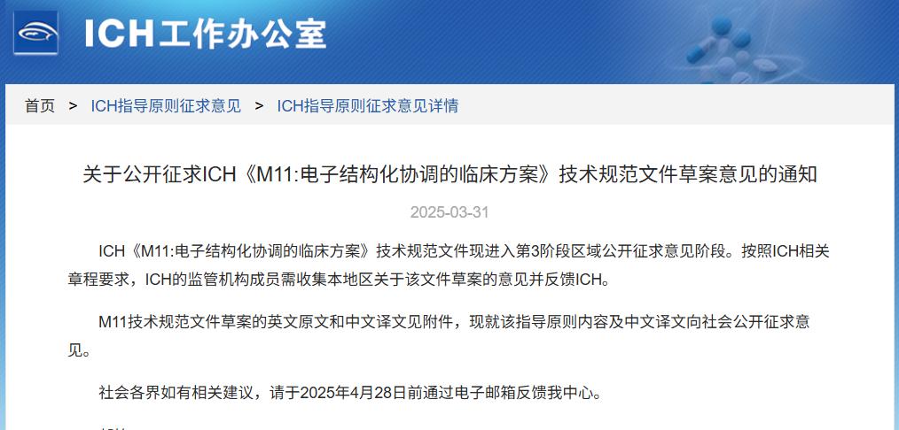關(guān)于公開征求ICH《M11:電子結(jié)構(gòu)化協(xié)調(diào)的臨床方案》技術(shù)規(guī)范文件草案意見的通知
