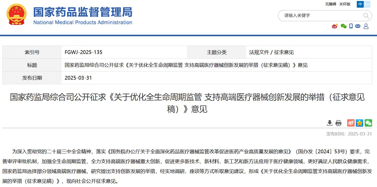 國家藥監(jiān)局綜合司公開征求《關(guān)于優(yōu)化全生命周期監(jiān)管 支持高端醫(yī)療器械創(chuàng)新發(fā)展的舉措(征求意見稿)》意見