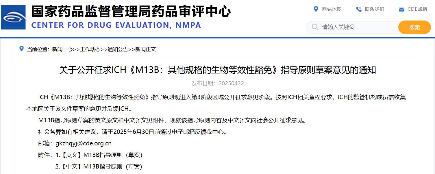 關(guān)于公開(kāi)征求ICH《M13B:其他規(guī)格的生物等效性豁免》指導(dǎo)原則草案意見(jiàn)的通知