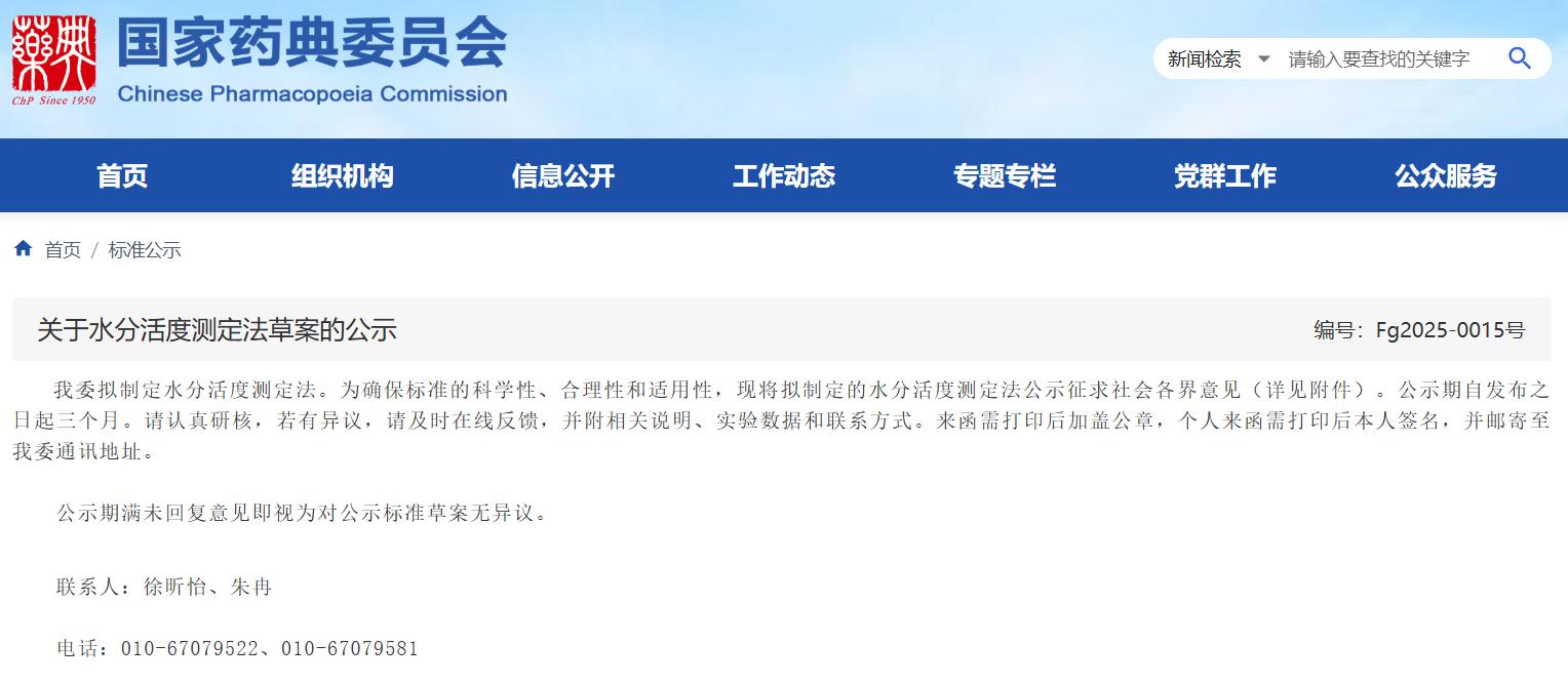 為確保標準的科學性、合理性和適用性,現(xiàn)將擬制定的水分活度測定法公示征求社會各界意見。