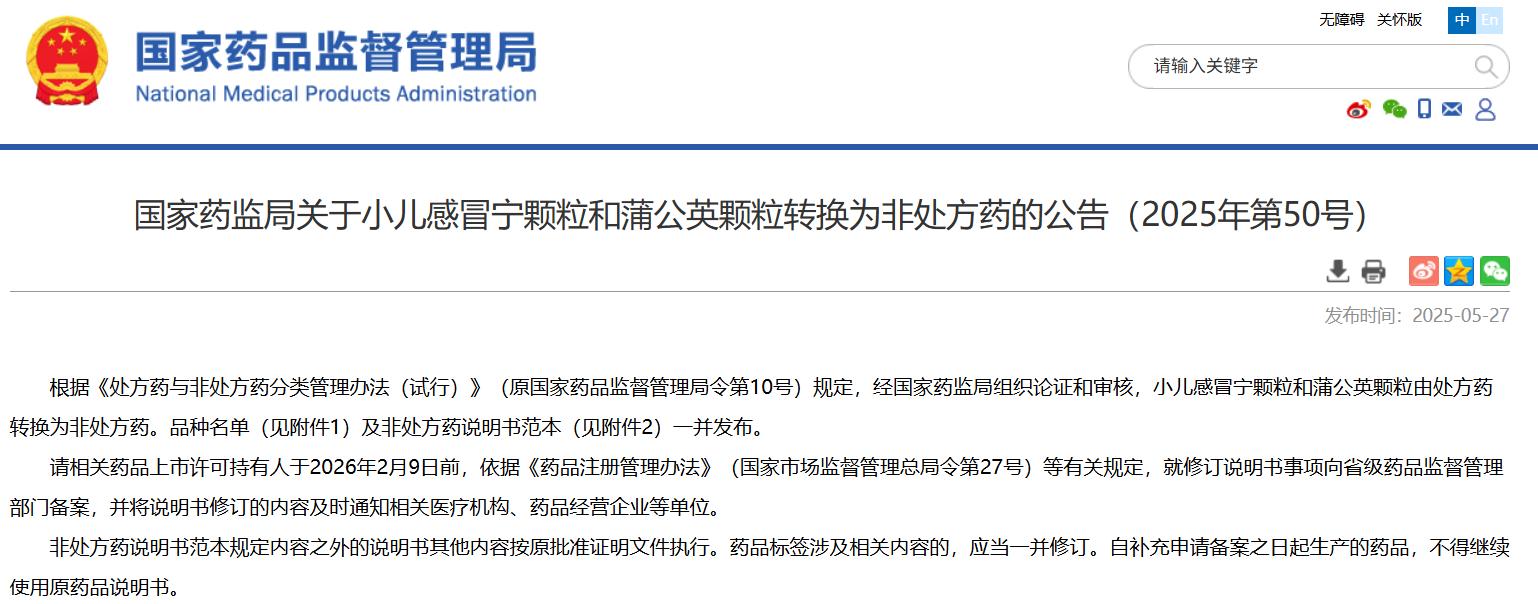 國家藥監(jiān)局關于小兒感冒寧顆粒和蒲公英顆粒轉(zhuǎn)換為非處方藥的公告(2025年第50號)