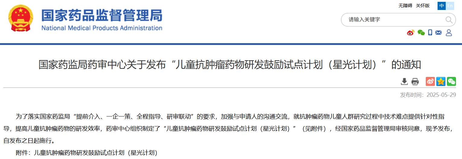 國家藥監(jiān)局藥審中心關于發(fā)布“兒童抗腫瘤藥物研發(fā)鼓勵試點計劃(星光計劃)”的通知
