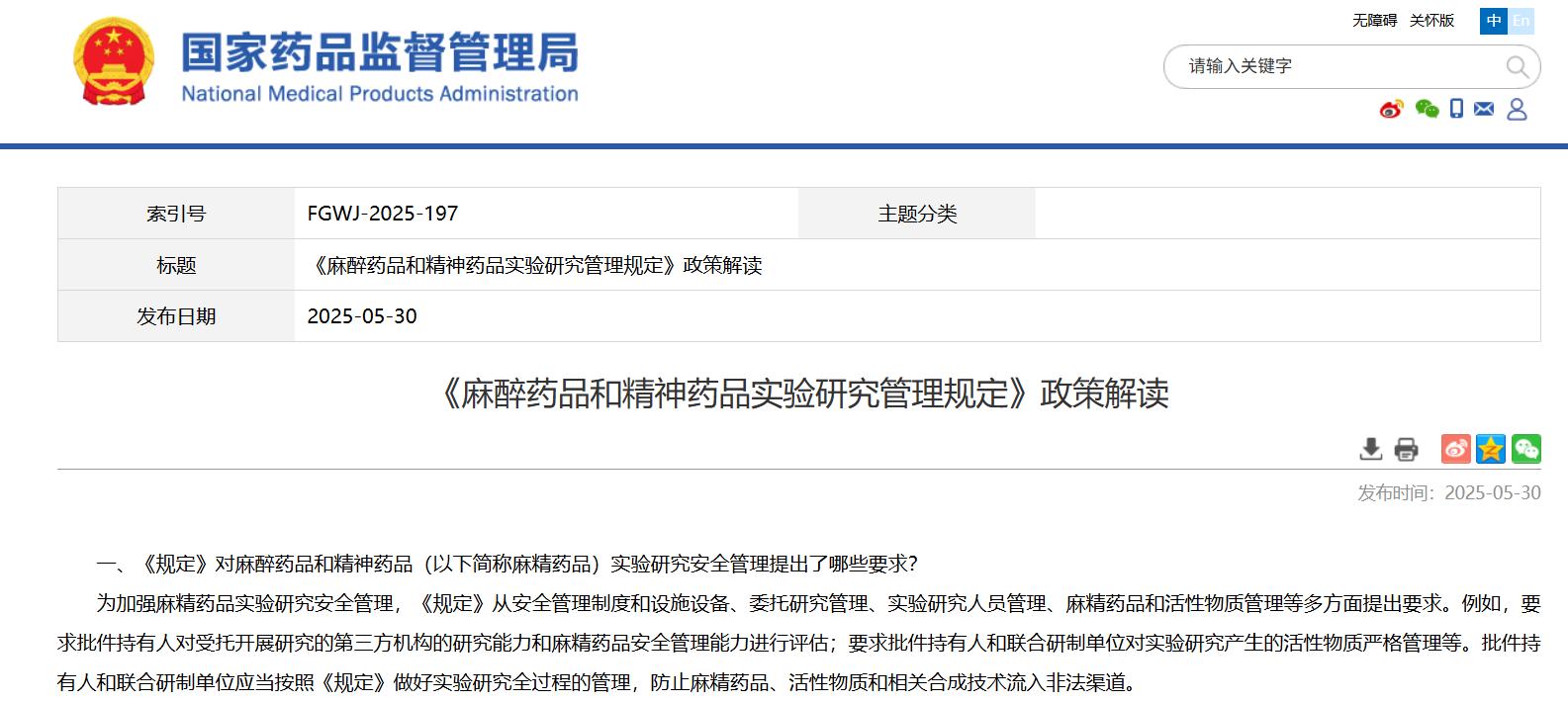 國家藥監(jiān)局關于發(fā)布麻醉藥品和精神藥品實驗研究管理規(guī)定的公告(2025年第51號)
