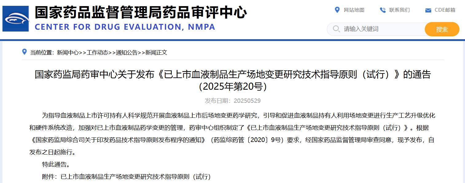 國家藥監(jiān)局藥審中心關于發(fā)布《已上市血液制品生產(chǎn)場地變更研究技術指導原則(試行)》的通告(2025年第20號)