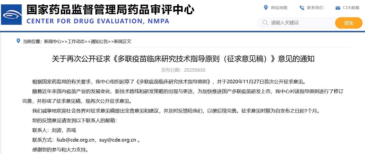 關(guān)于再次公開征求《多聯(lián)疫苗臨床研究技術(shù)指導原則(征求意見稿)》意見的通知