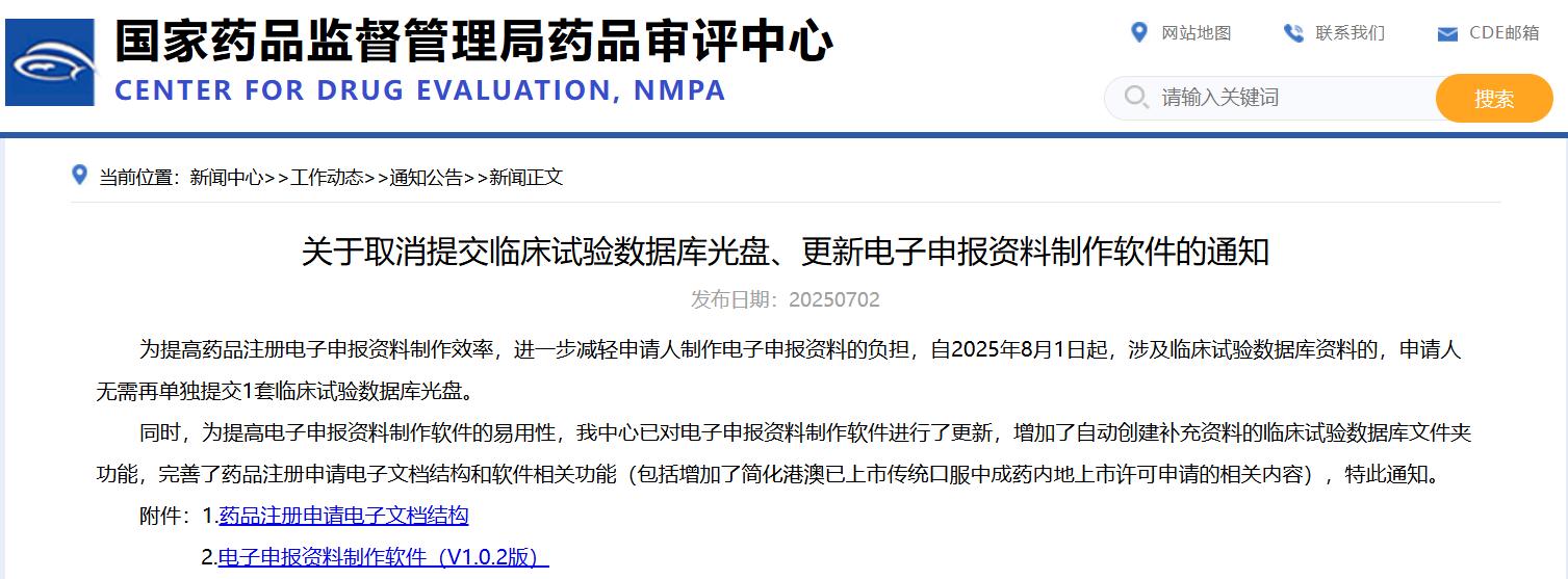 關(guān)于取消提交臨床試驗數(shù)據(jù)庫光盤、更新電子申報資料制作軟件的通知
