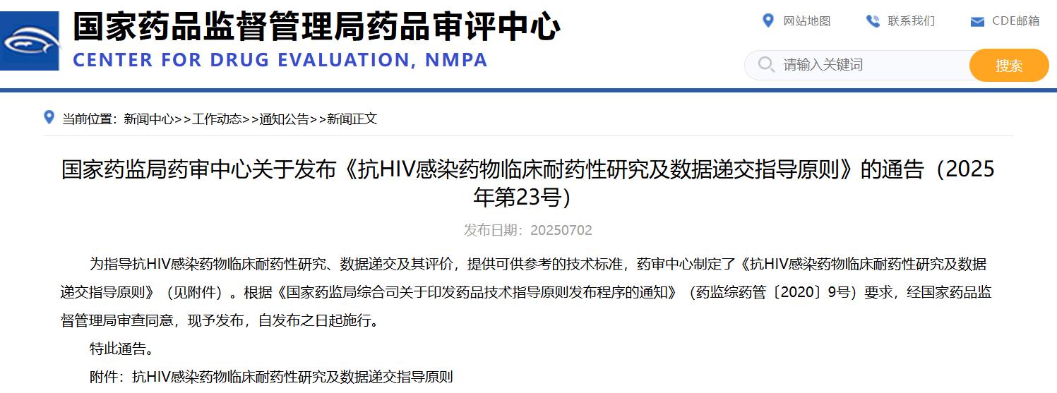 國家藥監(jiān)局藥審中心關(guān)于發(fā)布《抗HIV感染藥物臨床耐藥性研究及數(shù)據(jù)遞交指導原則》的通告(2025年第23號)