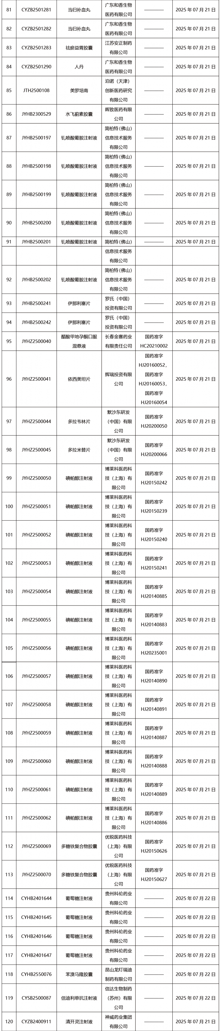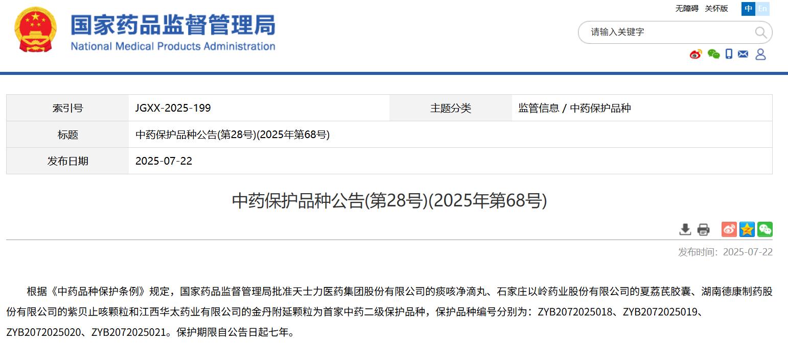 國(guó)家藥監(jiān)局關(guān)于中藥保護(hù)品種的公告(延長(zhǎng)保護(hù)期第23號(hào))(2025年第70號(hào))