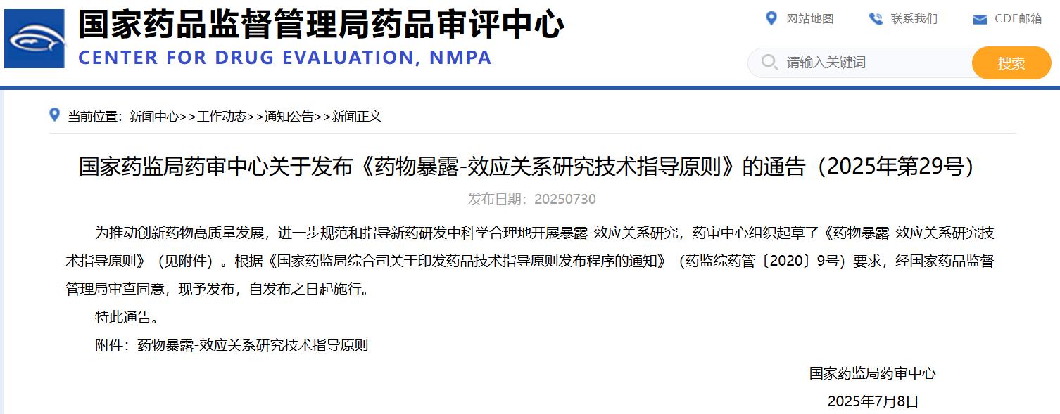 國(guó)家藥監(jiān)局藥審中心關(guān)于發(fā)布《藥物暴露-效應(yīng)關(guān)系研究技術(shù)指導(dǎo)原則》的通告(2025年第29號(hào))