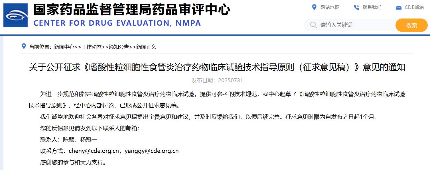 關(guān)于公開征求《嗜酸性粒細(xì)胞性食管炎治療藥物臨床試驗(yàn)技術(shù)指導(dǎo)原則(征求意見稿)》意見的通知