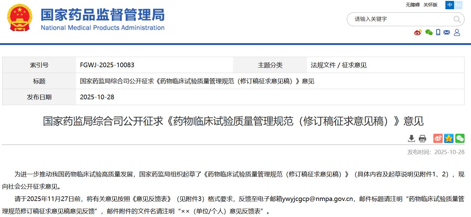 國(guó)家藥監(jiān)局綜合司公開(kāi)征求《藥物臨床試驗(yàn)質(zhì)量管理規(guī)范(修訂稿征求意見(jiàn)稿)》意見(jiàn)