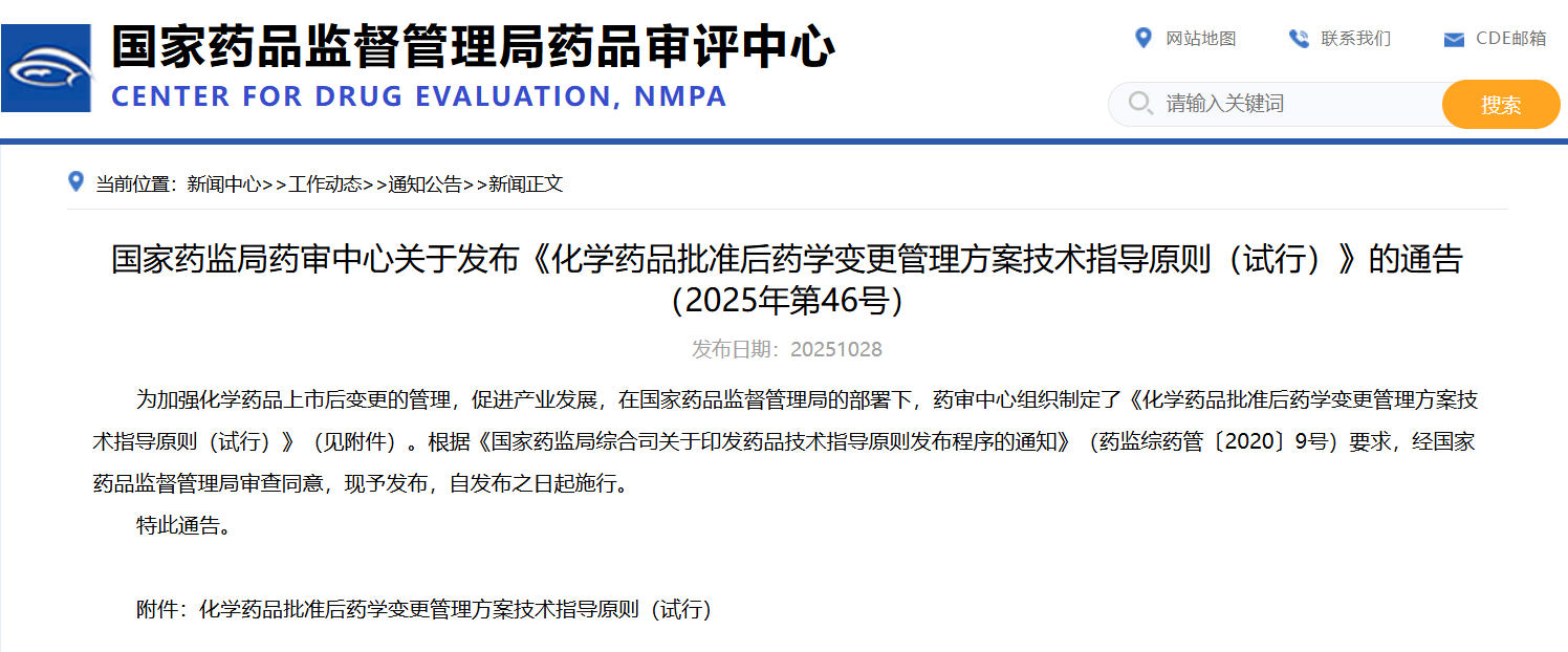國(guó)家藥監(jiān)局藥審中心關(guān)于發(fā)布《化學(xué)藥品批準(zhǔn)后藥學(xué)變更管理方案技術(shù)指導(dǎo)原則(試行)》的通告(2025年第46號(hào))