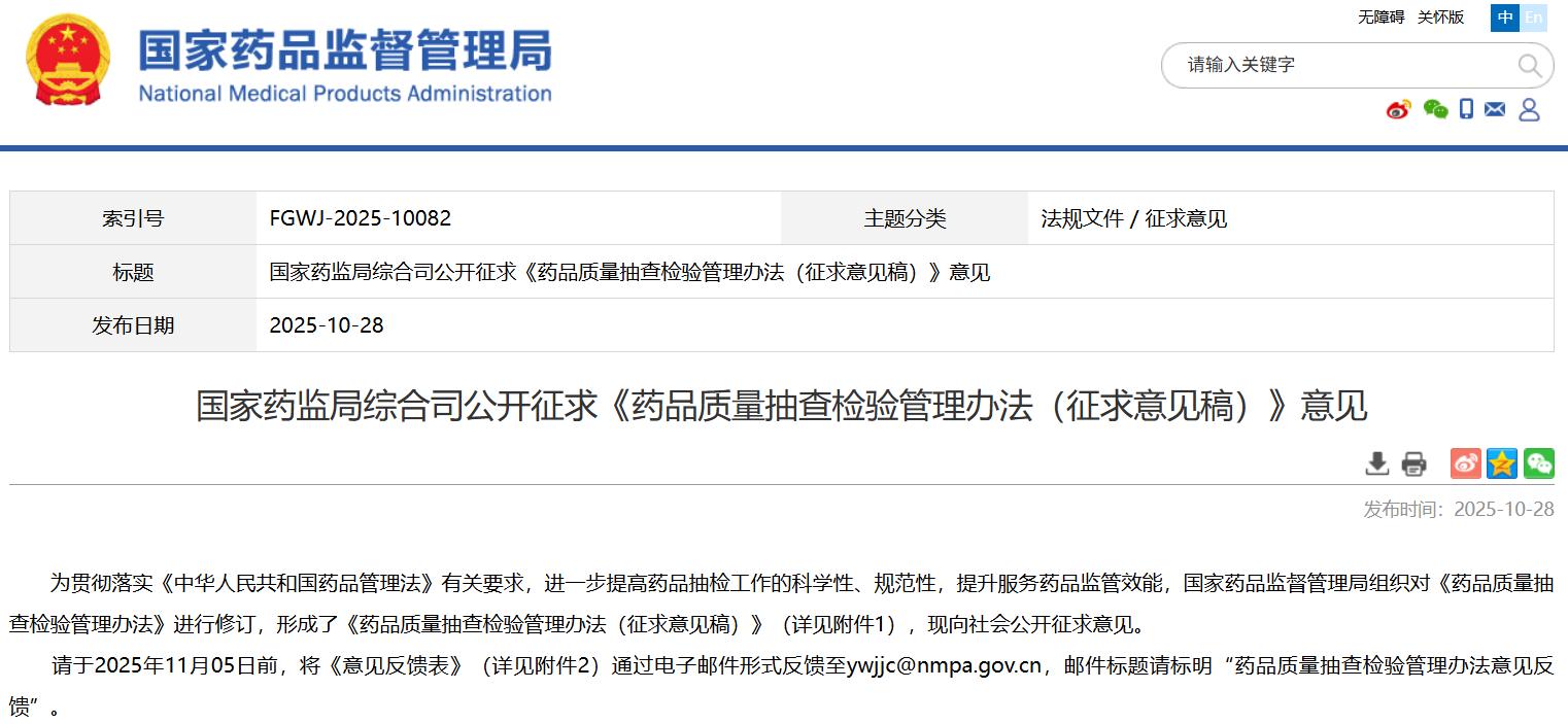 國(guó)家藥監(jiān)局綜合司公開(kāi)征求《藥品質(zhì)量抽查檢驗(yàn)管理辦法(征求意見(jiàn)稿)》意見(jiàn)