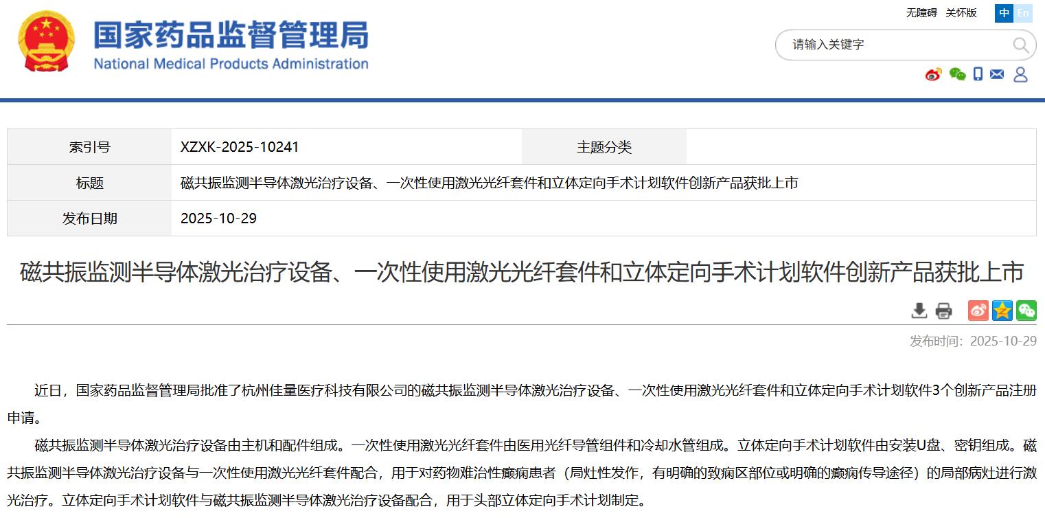 磁共振監(jiān)測(cè)半導(dǎo)體激光治療設(shè)備、一次性使用激光光纖套件和立體定向手術(shù)計(jì)劃軟件創(chuàng)新產(chǎn)品獲批上市