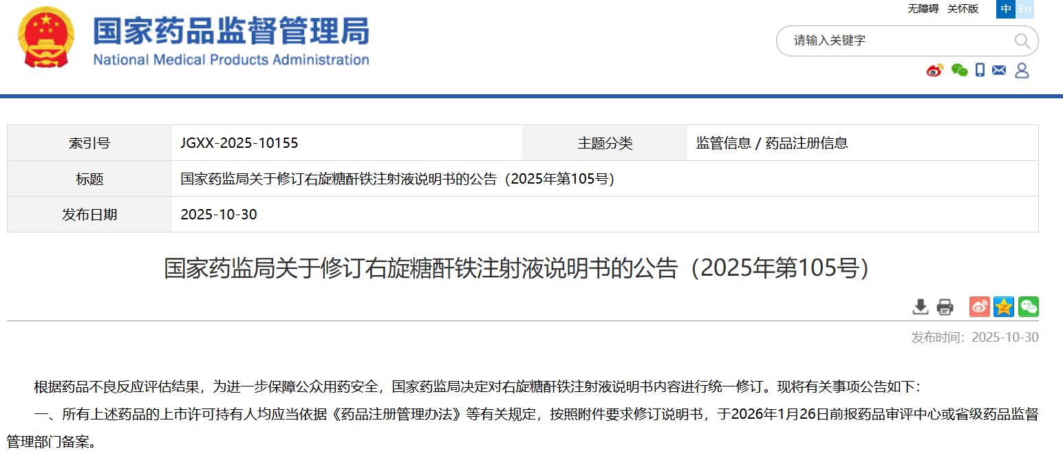 國(guó)家藥監(jiān)局關(guān)于修訂右旋糖酐鐵注射液說(shuō)明書(shū)的公告(2025年第105號(hào))