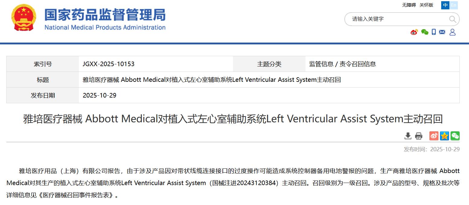 雅培醫(yī)療器械 Abbott Medical對(duì)植入式左心室輔助系統(tǒng)Left Ventricular Assist System主動(dòng)召回