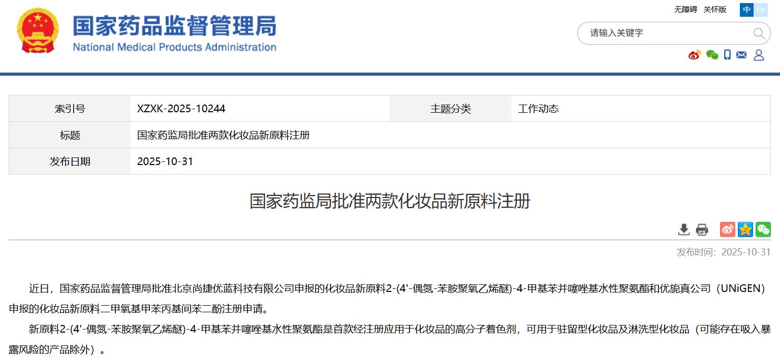 國(guó)家藥監(jiān)局批準(zhǔn)兩款化妝品新原料注冊(cè)