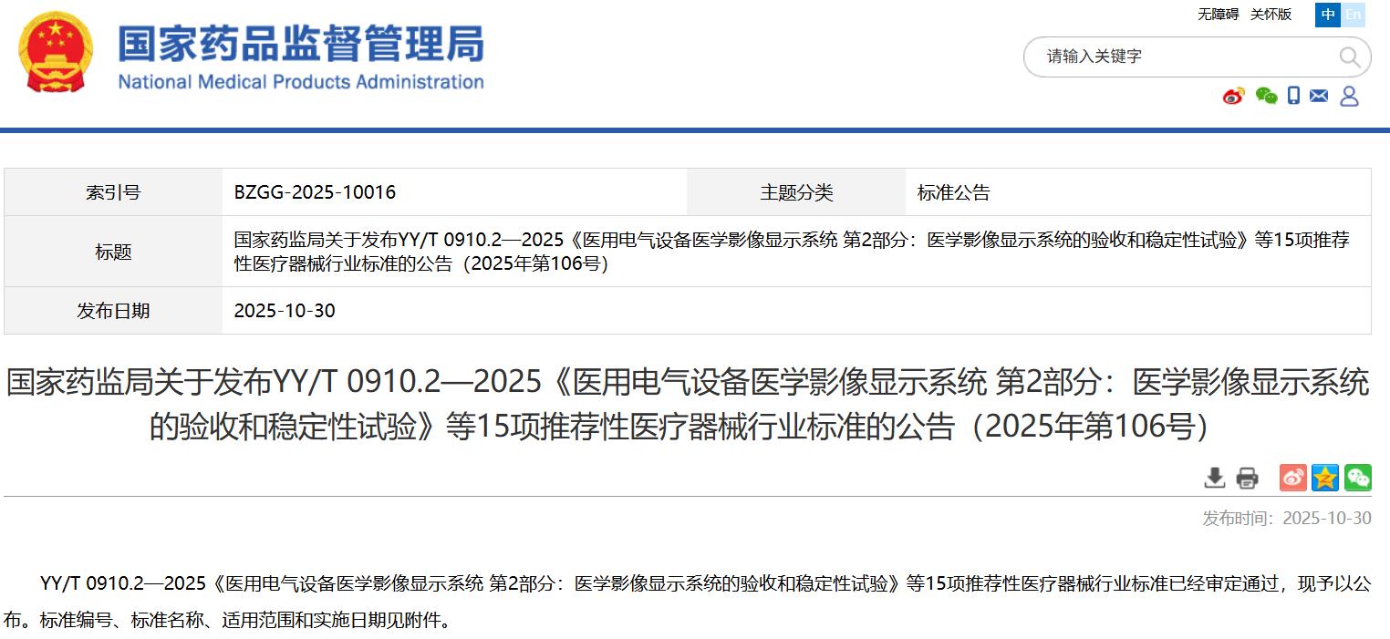 國(guó)家藥監(jiān)局關(guān)于發(fā)布YY/T 0910.2—2025《醫(yī)用電氣設(shè)備醫(yī)學(xué)影像顯示系統(tǒng) 第2部分:醫(yī)學(xué)影像顯示系統(tǒng)的驗(yàn)收和穩(wěn)定性試驗(yàn)》等15項(xiàng)推薦性醫(yī)療器械行業(yè)標(biāo)準(zhǔn)的公告(2025年第106號(hào))