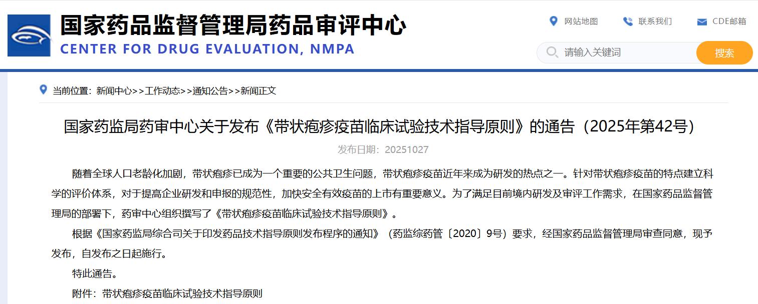 國(guó)家藥監(jiān)局藥審中心關(guān)于發(fā)布《帶狀皰疹疫苗臨床試驗(yàn)技術(shù)指導(dǎo)原則》的通告(2025年第42號(hào))