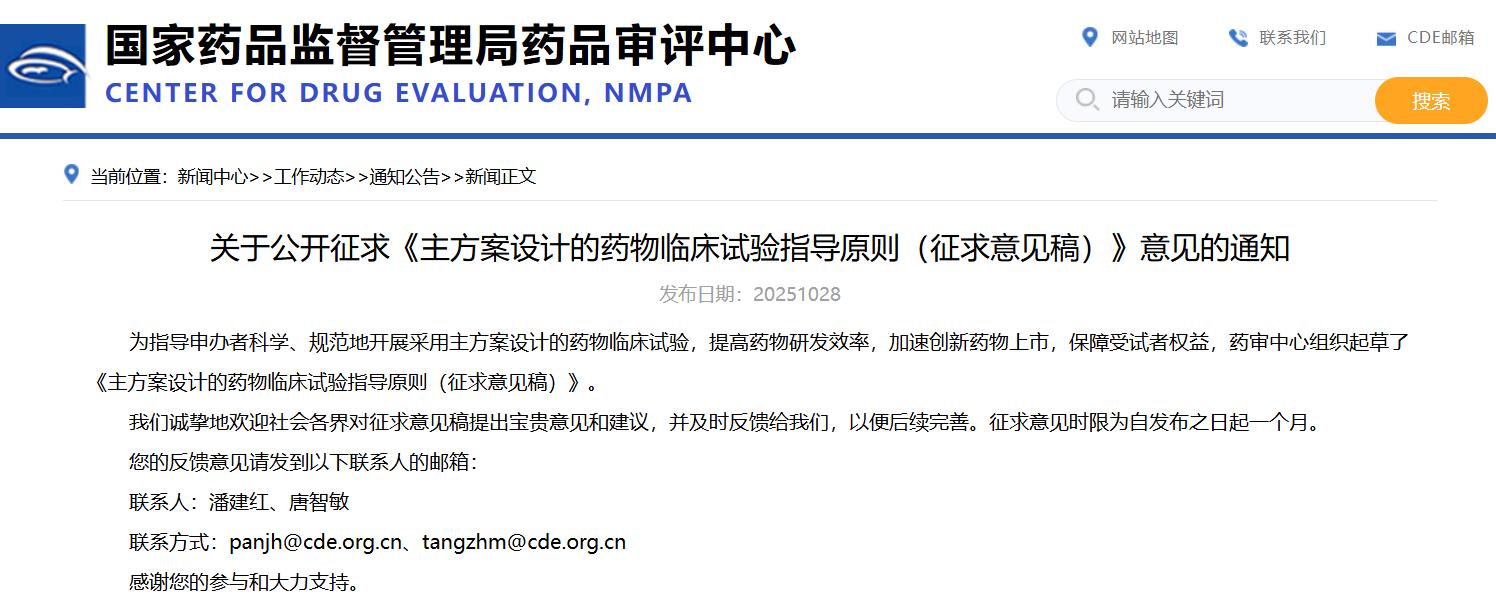 關(guān)于公開(kāi)征求《主方案設(shè)計(jì)的藥物臨床試驗(yàn)指導(dǎo)原則(征求意見(jiàn)稿)》意見(jiàn)的通知