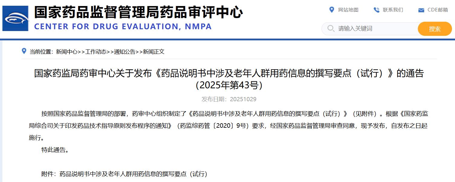 國(guó)家藥監(jiān)局藥審中心關(guān)于發(fā)布《藥品說(shuō)明書(shū)中涉及老年人群用藥信息的撰寫(xiě)要點(diǎn)(試行)》的通告(2025年第43號(hào))