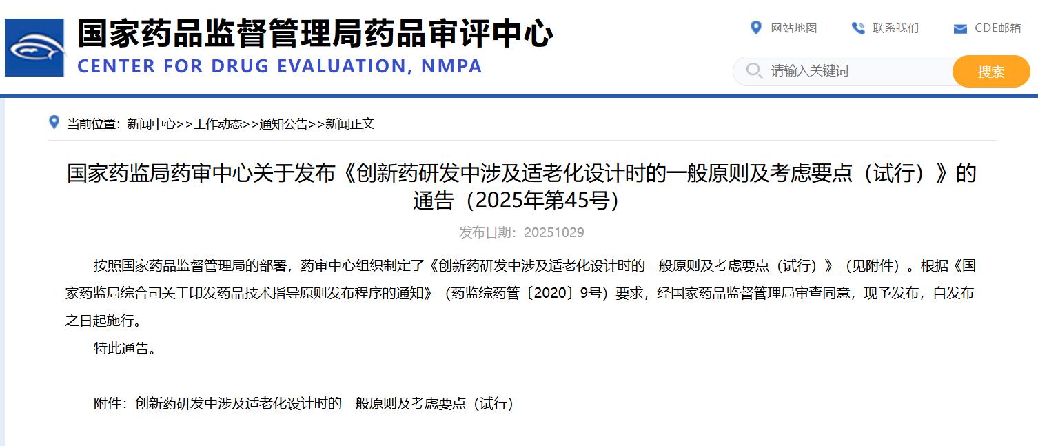 國(guó)家藥監(jiān)局藥審中心關(guān)于發(fā)布《創(chuàng)新藥研發(fā)中涉及適老化設(shè)計(jì)時(shí)的一般原則及考慮要點(diǎn)(試行)》的通告(2025年第45號(hào))