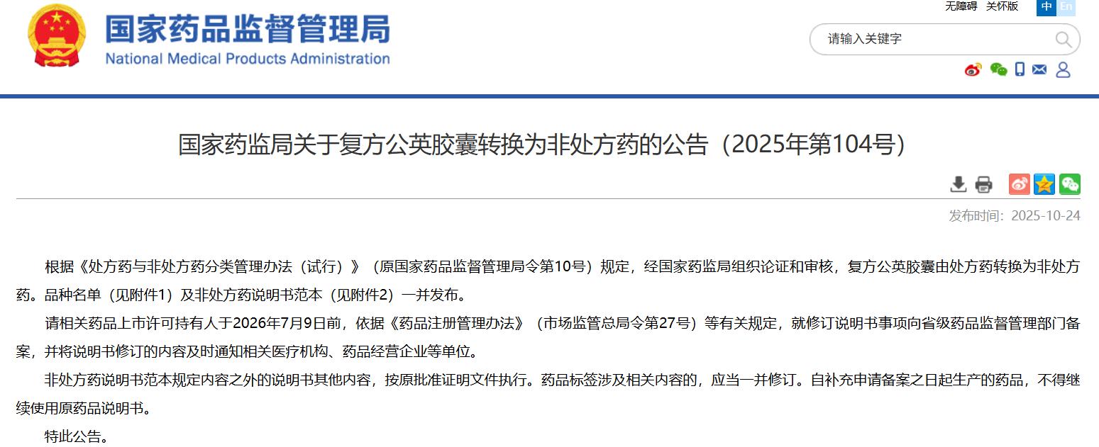 國(guó)家藥監(jiān)局關(guān)于復(fù)方公英膠囊轉(zhuǎn)換為非處方藥的公告(2025年第104號(hào))