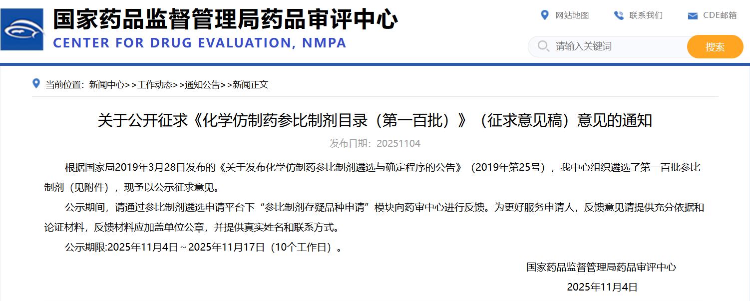 關于公開征求《化學仿制藥參比制劑目錄(第一百批)》(征求意見稿)意見的通知