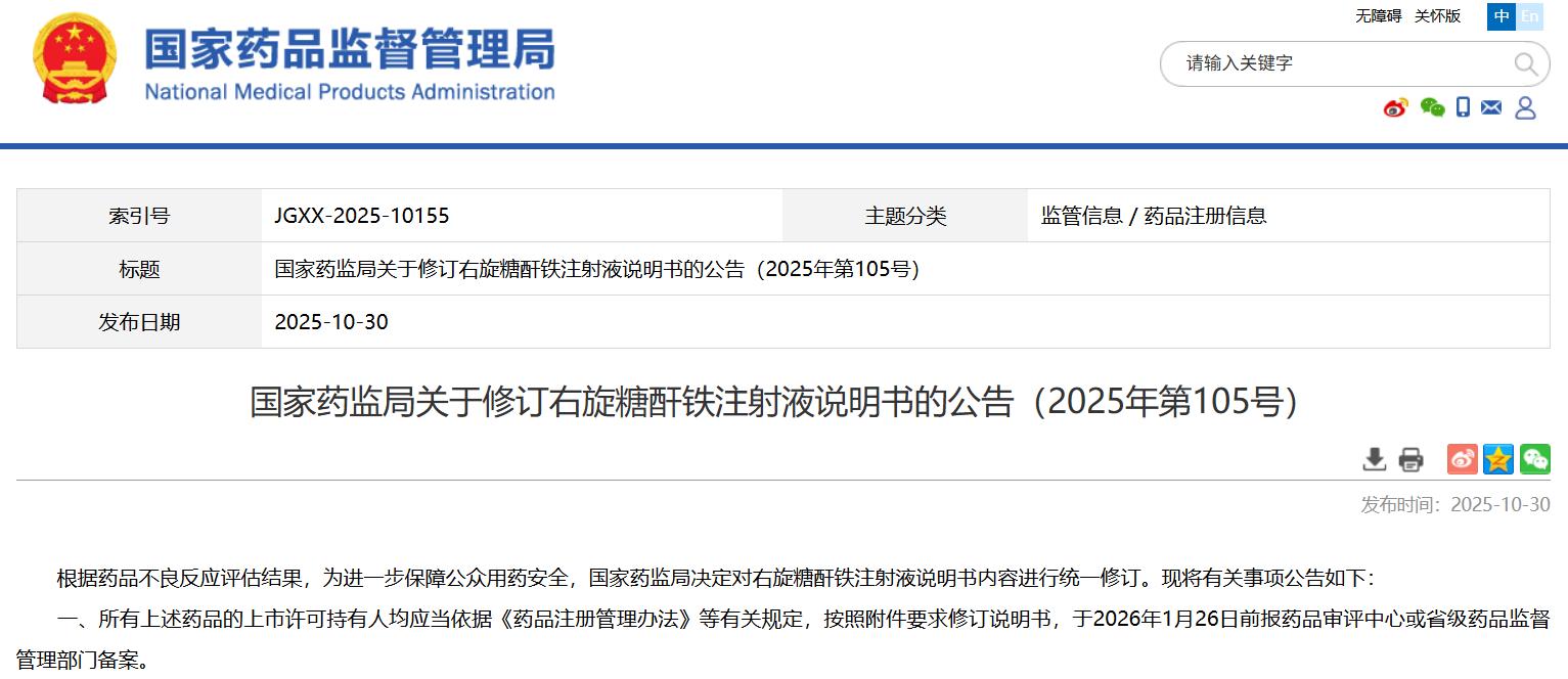 國家藥監(jiān)局關于修訂右旋糖酐鐵注射液說明書的公告(2025年第105號)