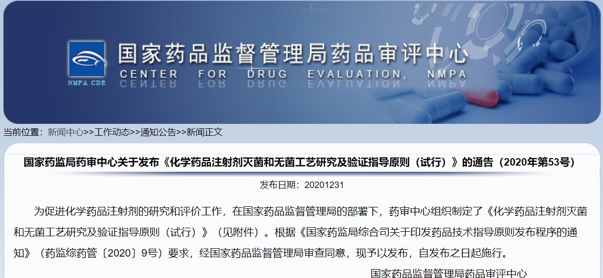關(guān)于發(fā)布《化學(xué)藥品注射劑滅菌和無菌工藝研究及驗證指導(dǎo)原則(試行)》的通告(2020年第53號)