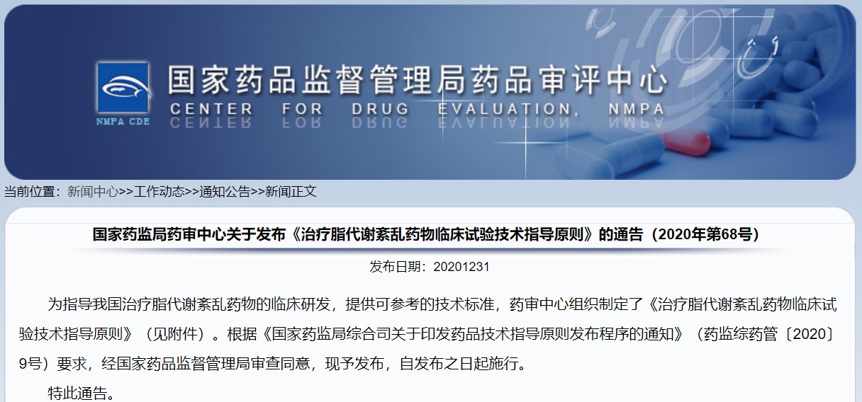 關(guān)于發(fā)布《治療脂代謝紊亂藥物臨床試驗技術(shù)指導(dǎo)原則》的通告(2020年第68號)
