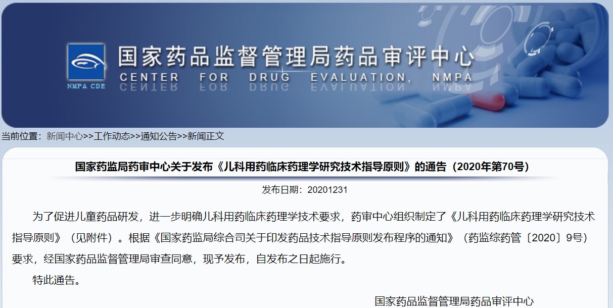 關(guān)于發(fā)布《兒科用藥臨床藥理學(xué)研究技術(shù)指導(dǎo)原則》的通告(2020年第70號)