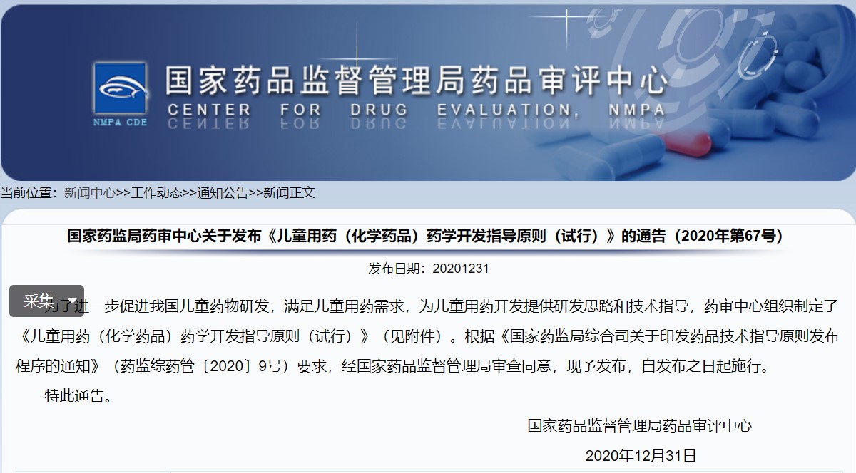 關(guān)于發(fā)布《兒童用藥(化學(xué)藥品)藥學(xué)開發(fā)指導(dǎo)原則(試行)》的通告(2020年第67號)