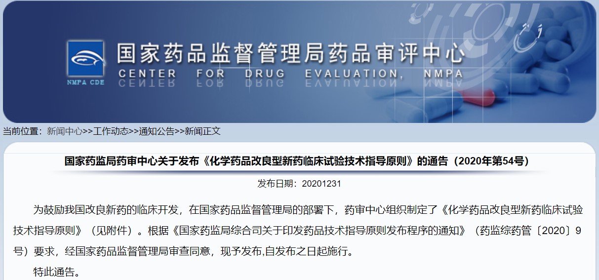 關(guān)于發(fā)布《化學(xué)藥品改良型新藥臨床試驗技術(shù)指導(dǎo)原則》的通告(2020年第54號)
