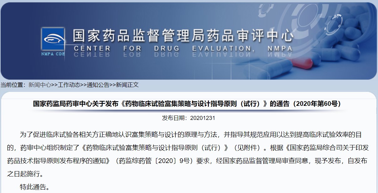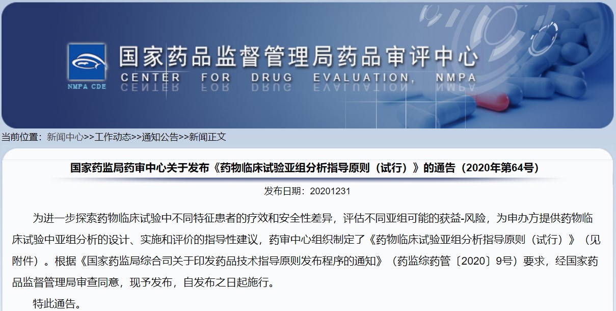 關(guān)于發(fā)布《藥物臨床試驗亞組分析指導(dǎo)原則(試行)》的通告(2020年第64號)