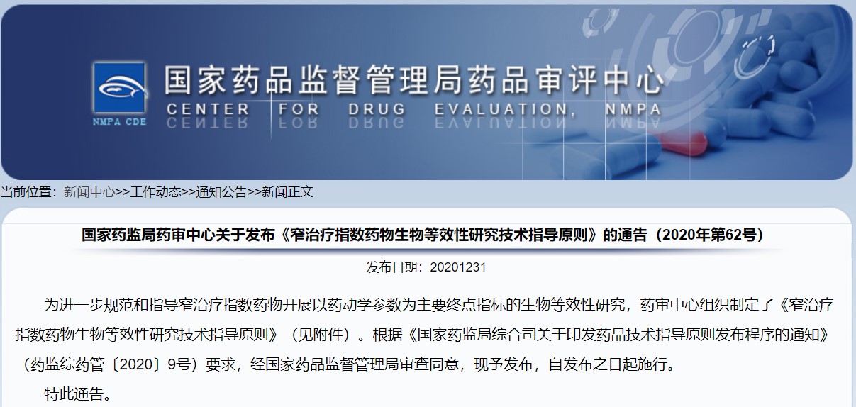 關(guān)于發(fā)布《窄治療指數(shù)藥物生物等效性研究技術(shù)指導(dǎo)原則》的通告(2020年第62號)