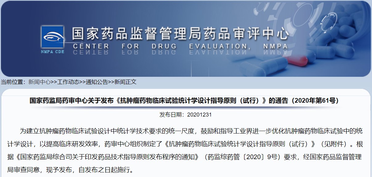 關(guān)于發(fā)布《抗腫瘤藥物臨床試驗統(tǒng)計學(xué)設(shè)計指導(dǎo)原則(試行)》的通告(2020年第61號)