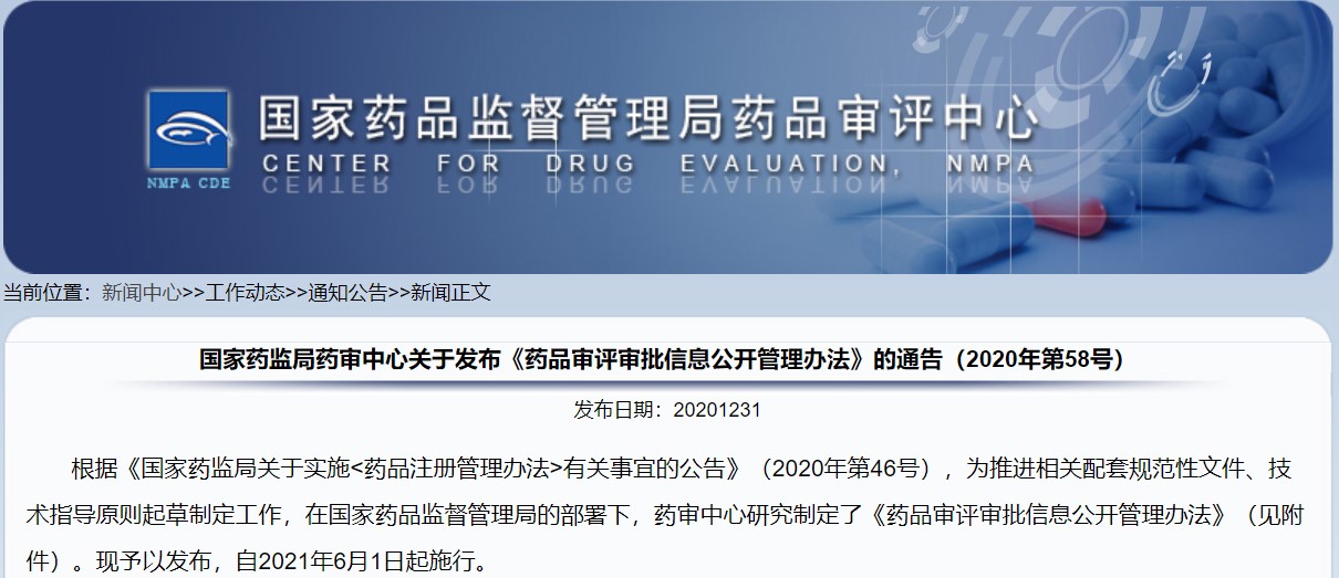 關(guān)于發(fā)布《藥品審評審批信息公開管理辦法》的通告(2020年第58號)