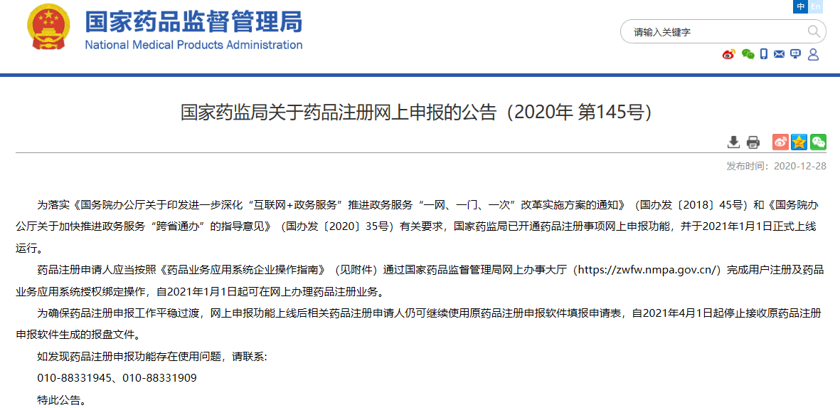 關(guān)于藥品注冊網(wǎng)上申報的公告(2020年 第145號)